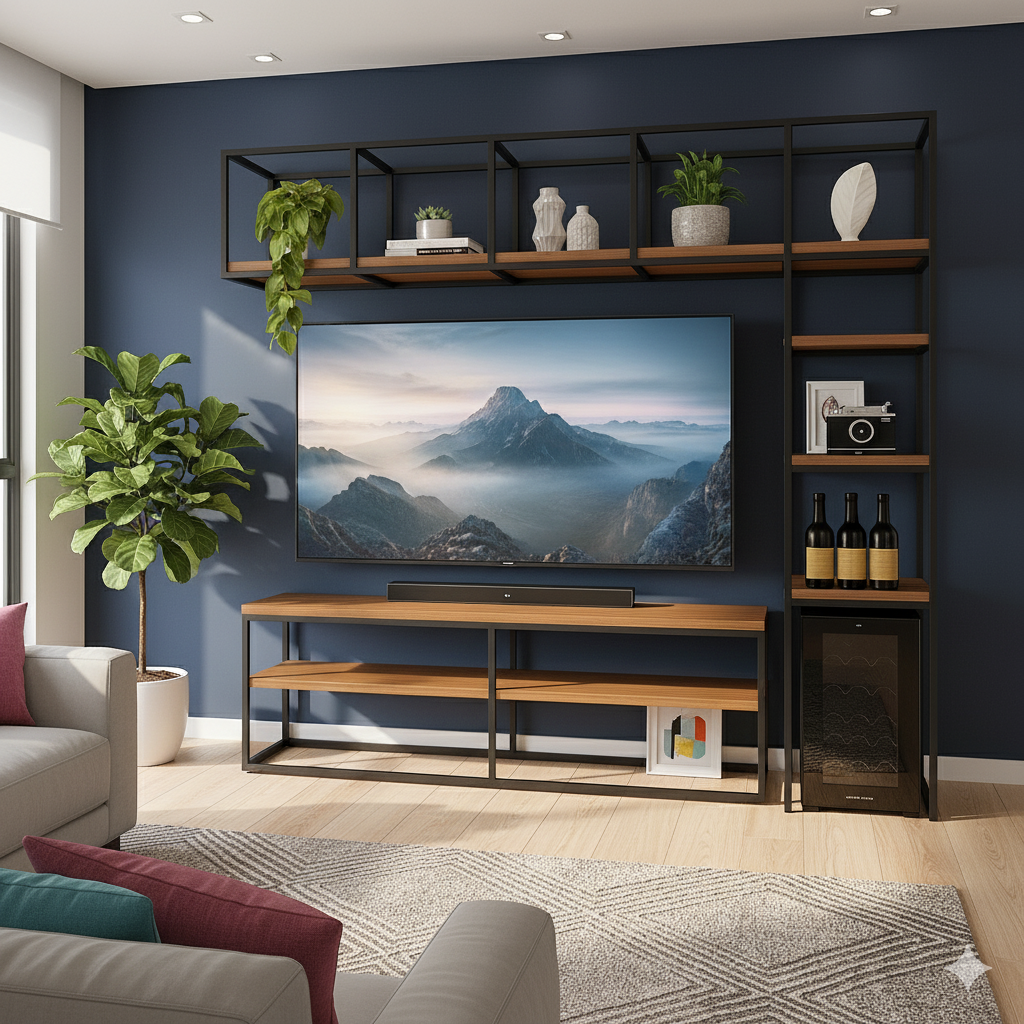 Rack estante estilo industrial, com prateleiras laterais e adega embutida. Estrutura em aço preto fosco e prateleiras em MDF madeira natural. Ideal para salas amplas, áreas gourmet e ambientes modernos.
